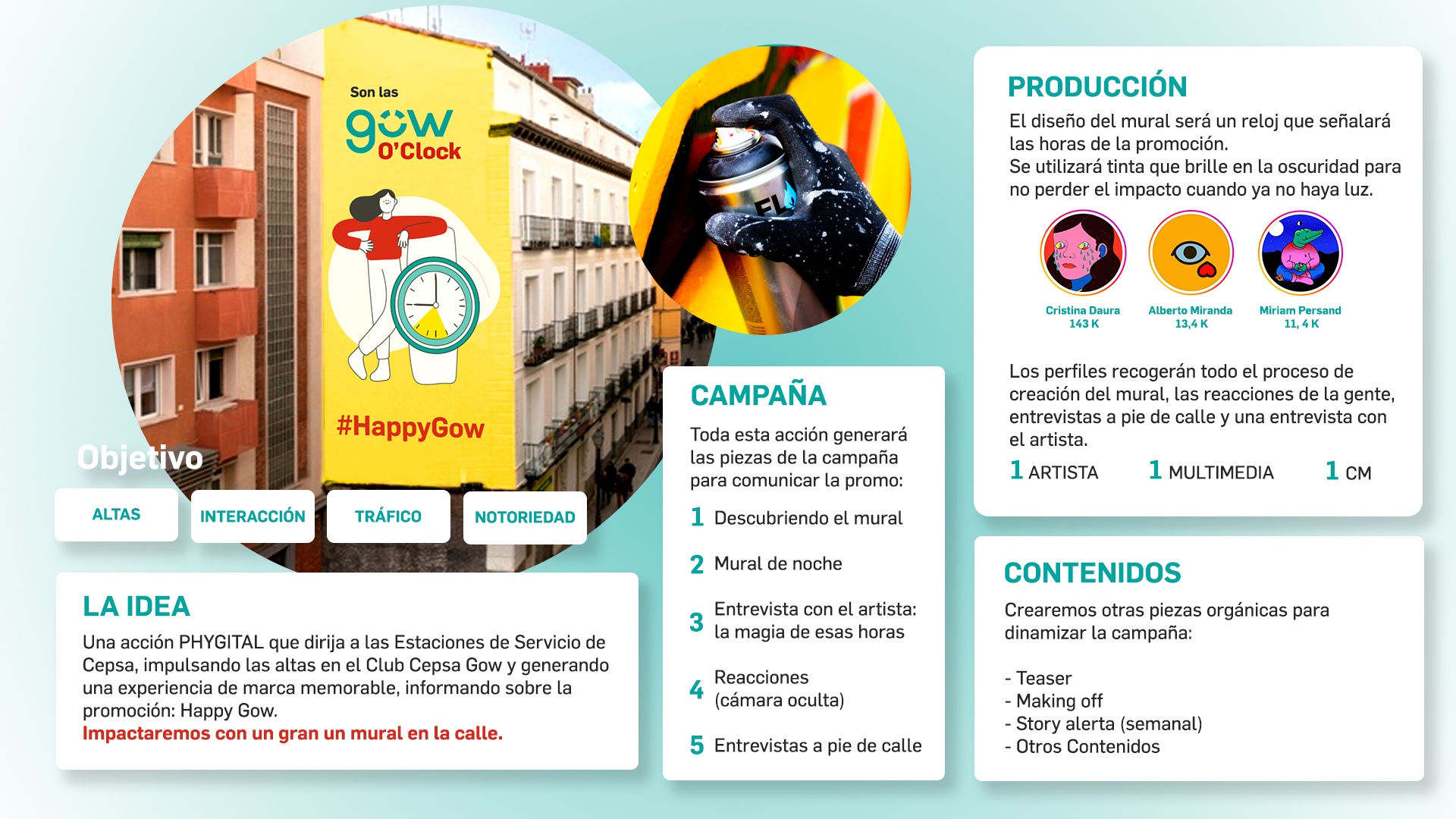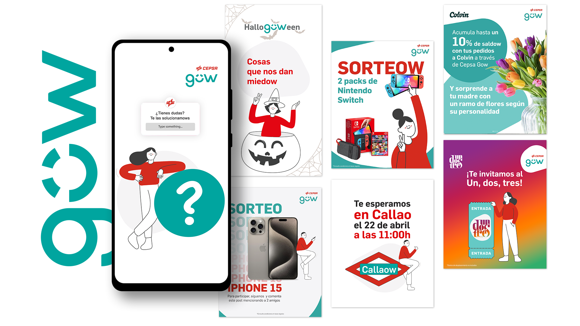 Uno de los principales ejes estratégicos de la marca en 2023 era el lanzamiento de su nueva marca de fidelización, Cepsa Gow. Para este lanzamiento creamos piezas y comunicaciones en las que los usuarios pudiesen conocer las ventajas. A nivel gráfico era importante diferenciar este contenido del de la marca en sí, dándole un estilo único con sus nuevas ilustraciones. También generamos diversas acciones con las que obtener repercusión y hacer ruido en redes sociales, así como contenidos nativos de redes mediante influencers y content creators.