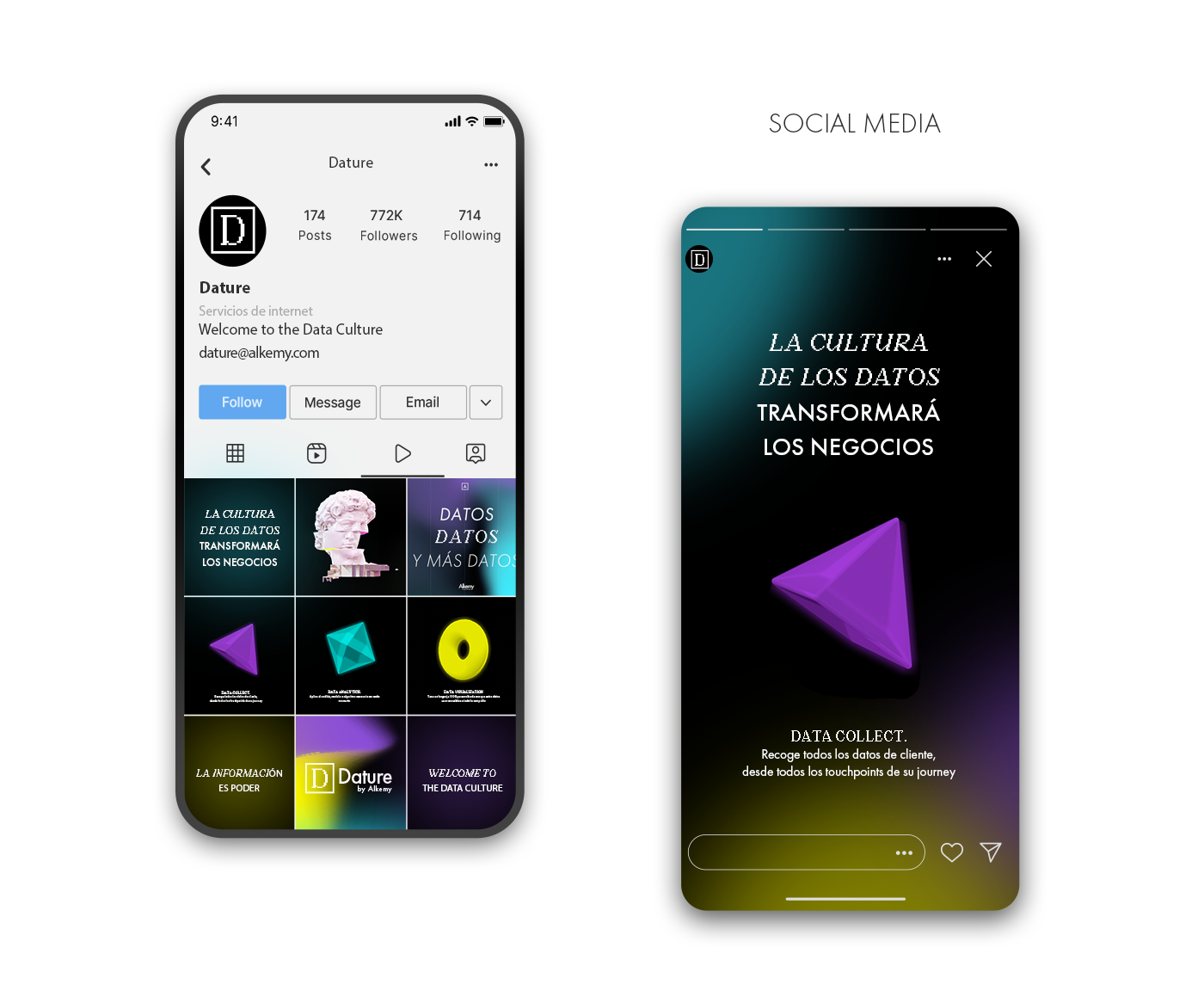 Dature es un producto digital que requería de una web moderna y concisa donde los usuarios pudiesen descubrir todas las posibilidades que ofrece. De esta web sacamos también los elementos gráficos que le dan identidad en redes, teniendo en cuenta que muchos de los contenidos tienen que convivir y destacar respecto a el branding de Alkemy.